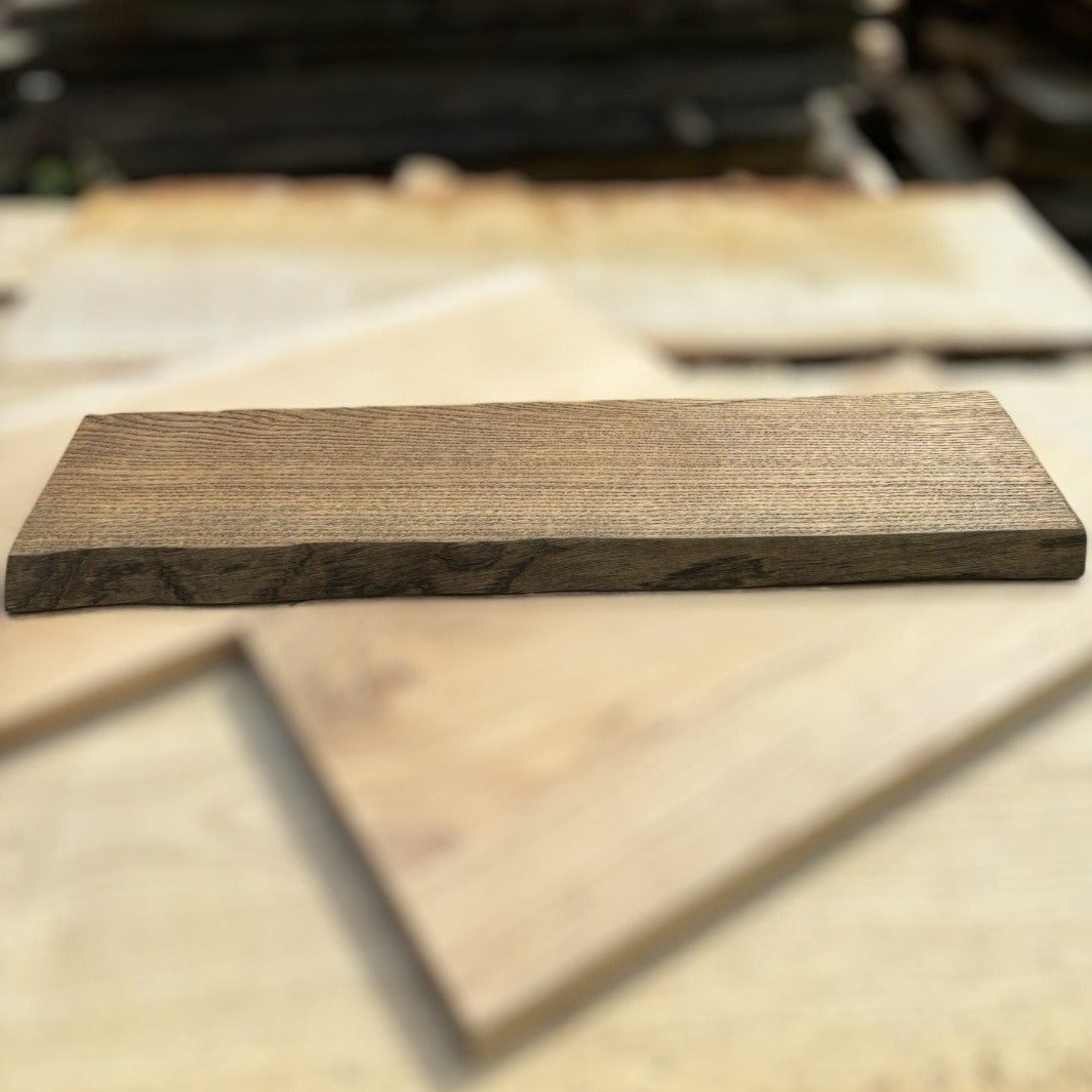 Rukou vyrobený dřevěný poliční stolek z pevného dubu s přirozeným okrajem a tloušťkou 2,5 cm.