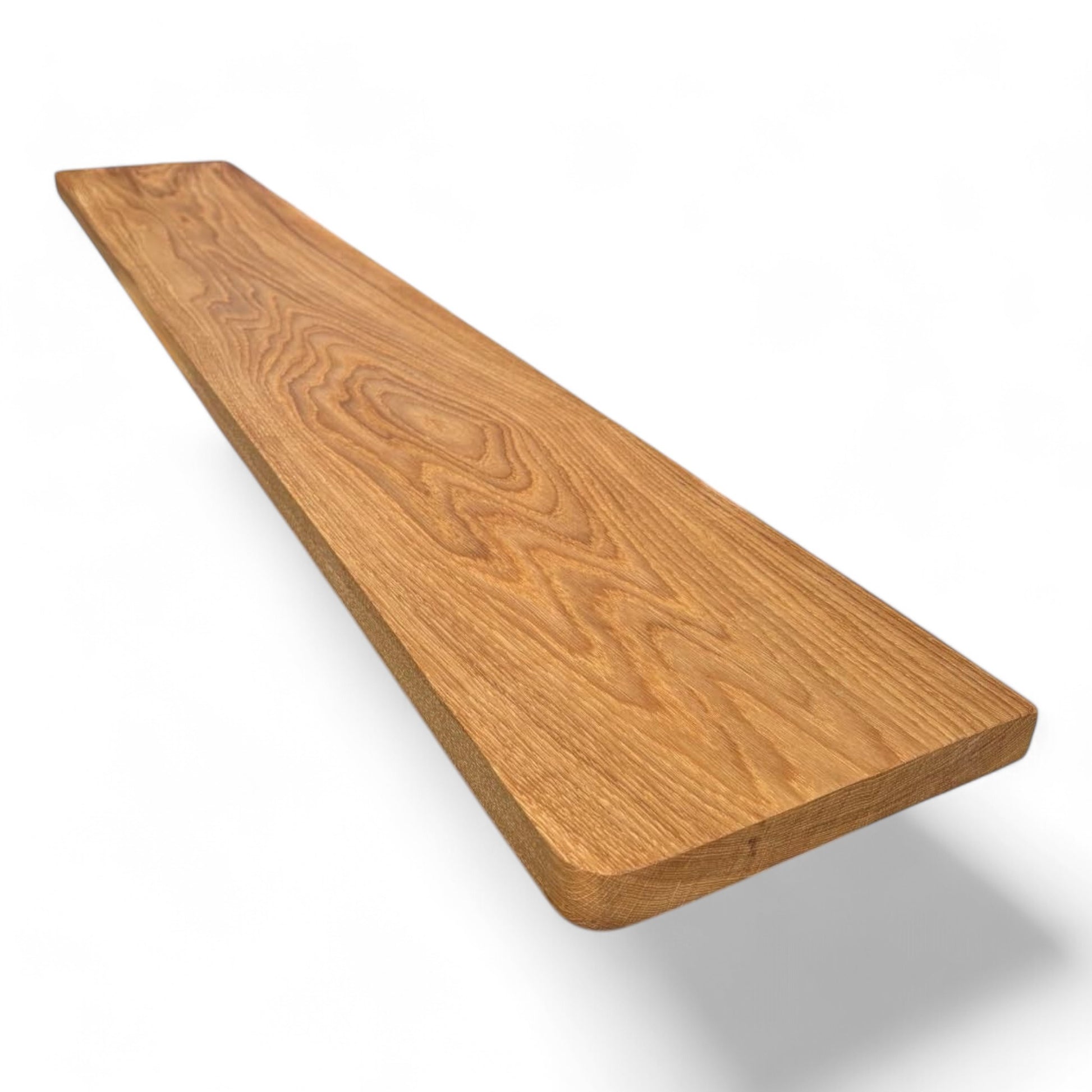Rukou vyrobený dřevěný poliční stolek z pevného dubu s přirozeným okrajem a tloušťkou 2,5 cm.