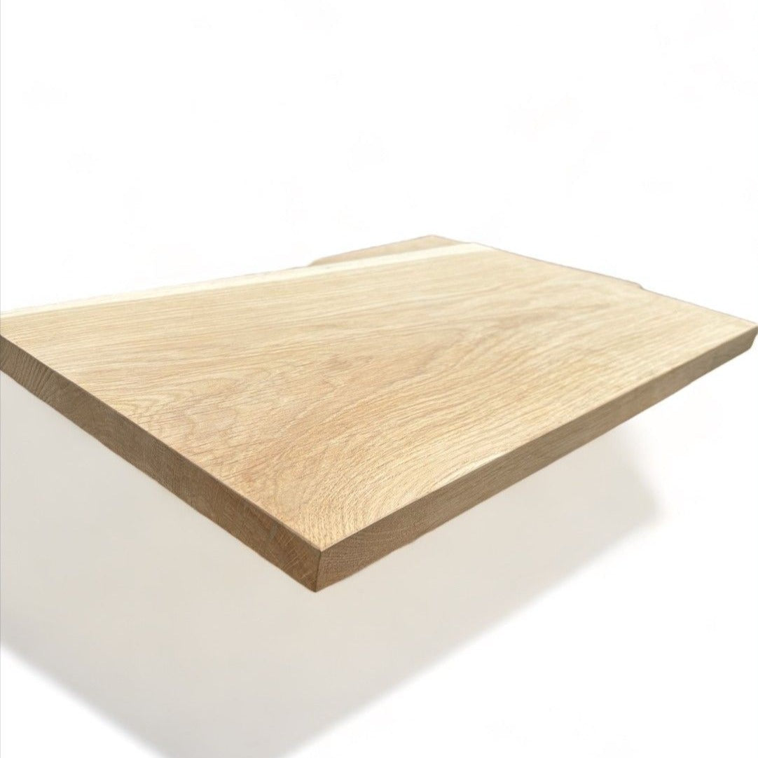 Rukou vyrobený dřevěný poliční stolek z pevného dubu s přirozeným okrajem a tloušťkou 2,5 cm.