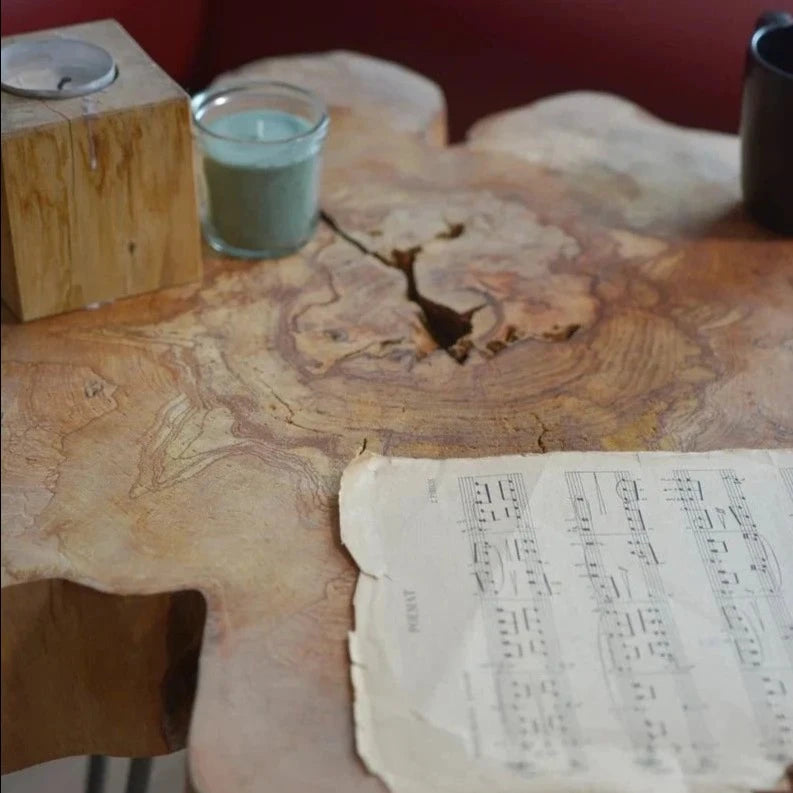 Blaty z pęknięciami, nieregularnymi kształtami i wyrazistymi cechami drewna charakteryzują się niezwykłą estetyką. Te nieoczekiwane elementy dodają stołom autentyczności i niezwykłego designu.